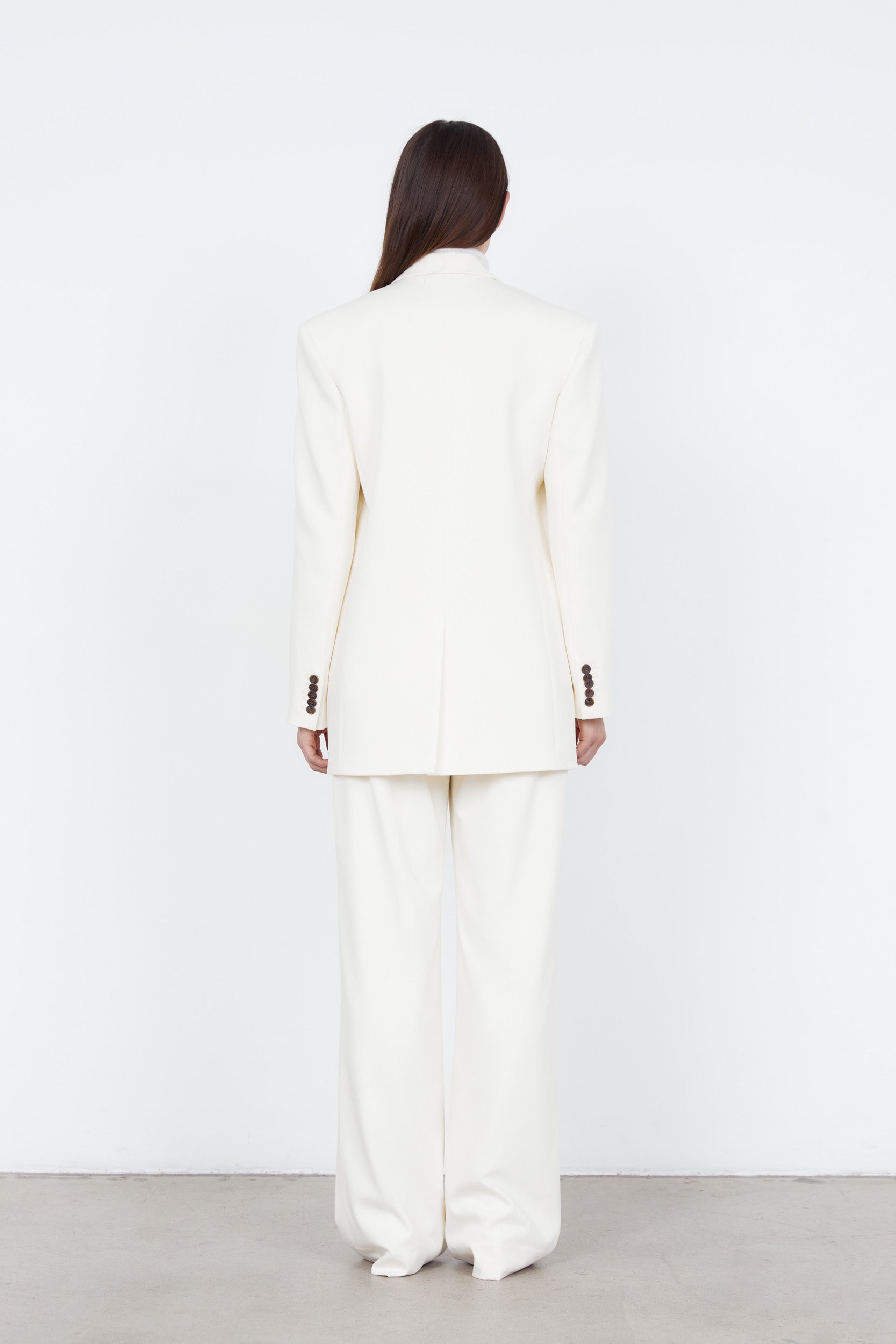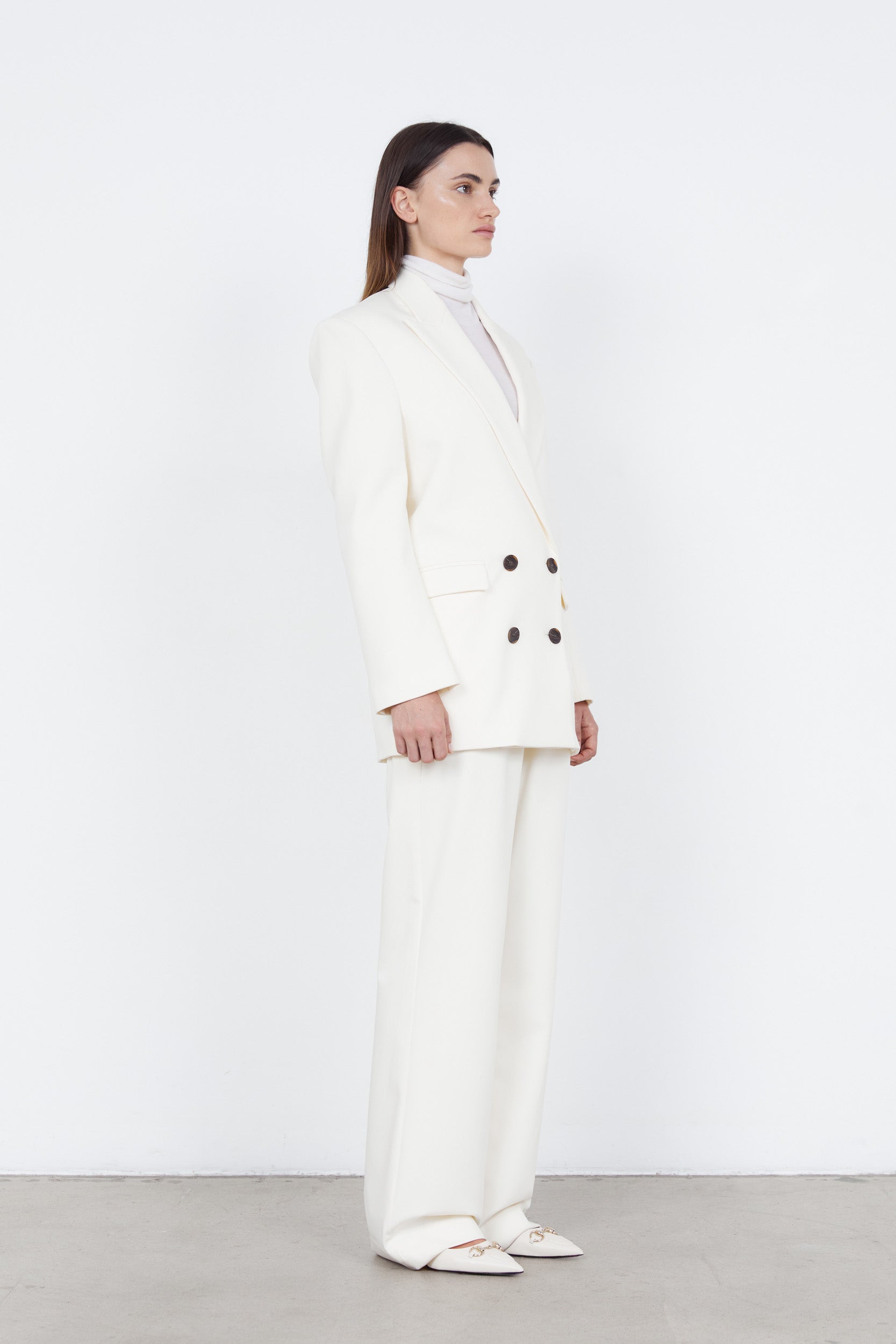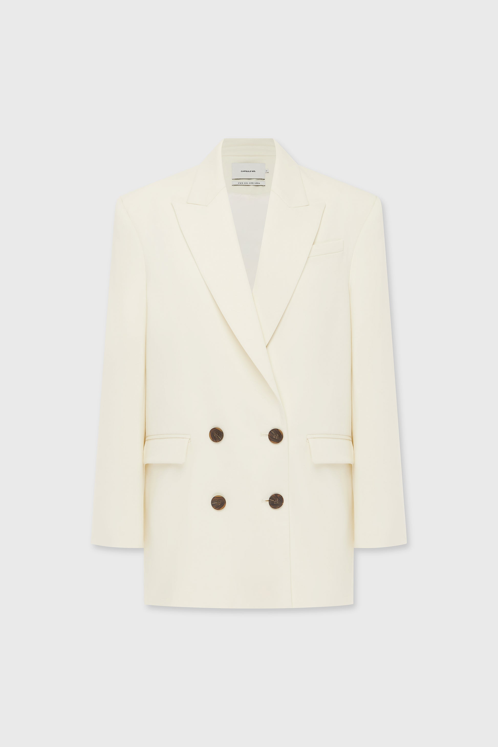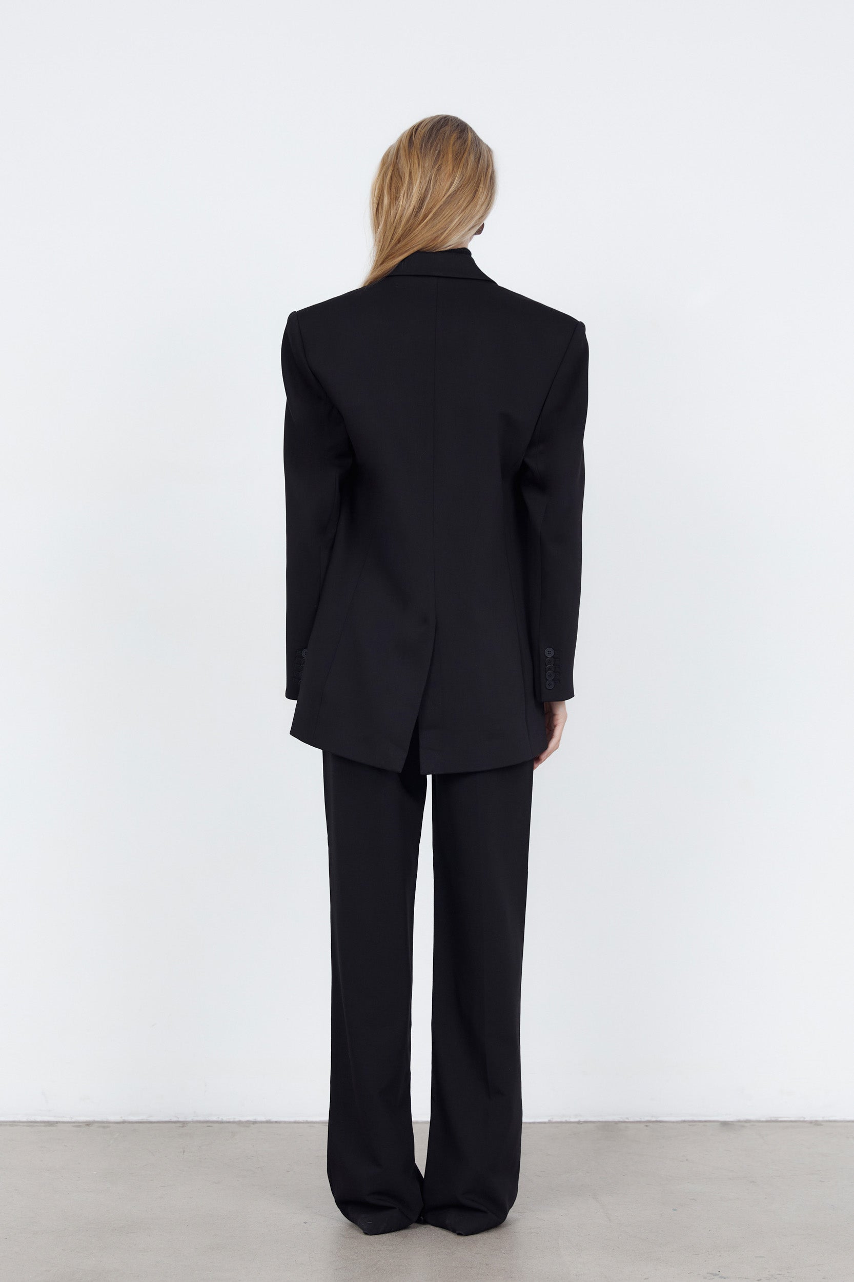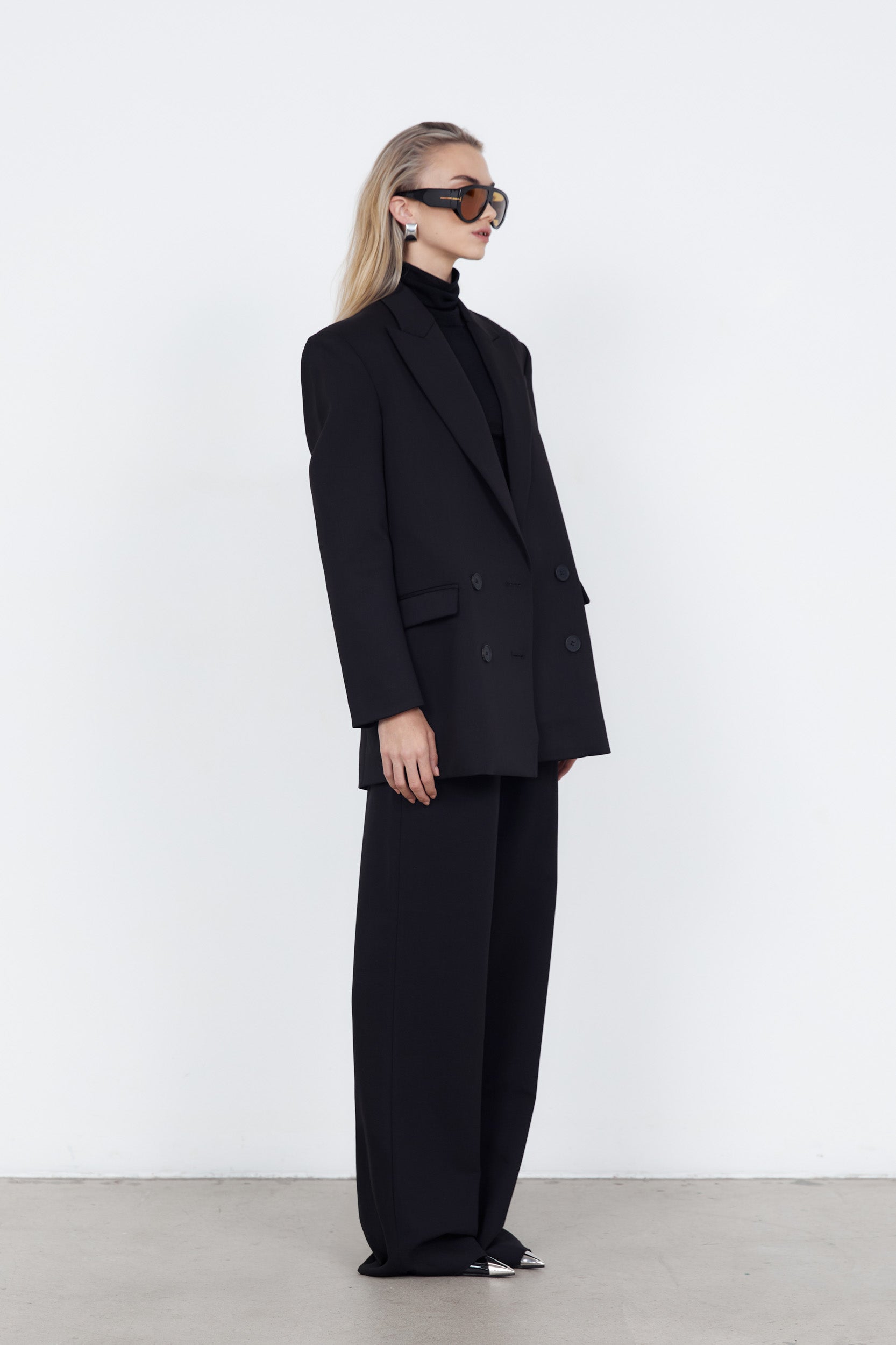The Double-Breasted Blazer. A modern take on classic men's tailoring, designed with an oversized silhouette and statement shoulders for a structured yet wearable fit. Featuring front darts for subtle shaping and a single back vent for movement, it layers effortlessly over tailoring, pairs with denim, or makes a statement on its own.