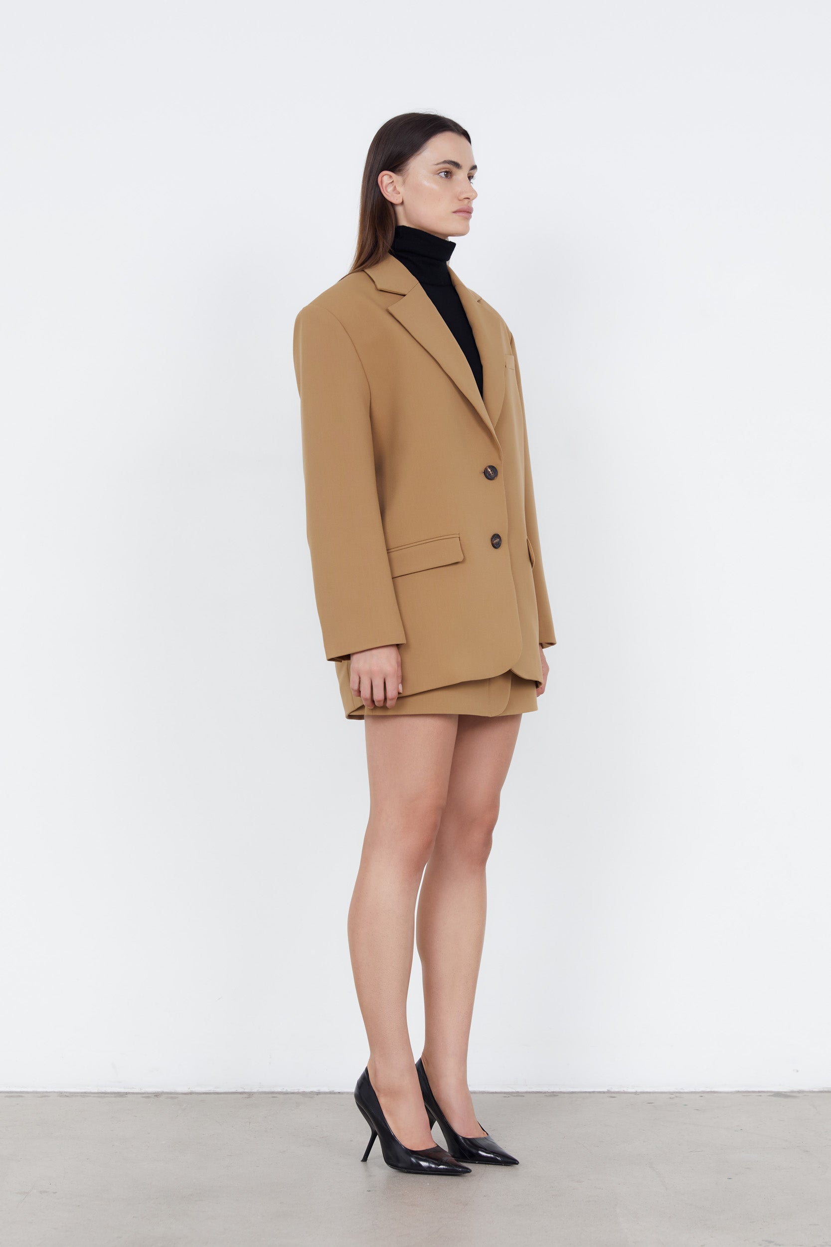 The Oversized Blazer. A capsule wardrobe staple designed for purposeful layering. With a structured yet relaxed silhouette, it refines casual looks and softens tailoring. Cut to sit off the body, it balances sharp lines with a refined drape. Whether styled with denim and a tee or layered over structured separates, it’s a foundational wardrobe piece.